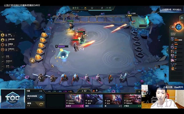 在第一局中,来自“小象大鹅”的Dae阿风选手在中期运营上人口的同时,卡利息搜牌就已经有了不低的质量,并且保持着连胜之势,为六剑六奥阵容成型打下基础。