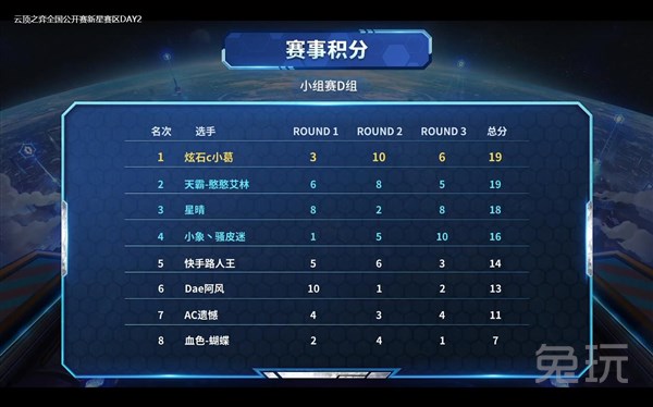 至此,新星赛区小组淘汰赛已经全部打完,D组中积分前四能够晋级的选手有:炫石c小葛,天霸-憨憨艾林,星晴和小象丶骚皮迷。让我们恭喜他们四位选手成功晋级,在半决赛中能够披荆斩棘,夺得更好的成绩!