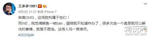 8月4日的比赛里WE以1:2不敌OMG,使自己晋级季后赛的道路变得困难。赛后王多多更新自己微博并在WE官博下留言: