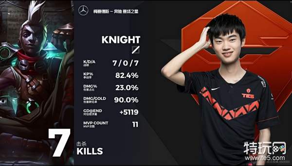 7分钟:ES瑟提从塔后三角草海克斯闪现闪出一个强手裂颅拉到TES下路双人组,配合豹女闪现跟上伤害成功击杀韦鲁斯,随后转头拿下土龙。