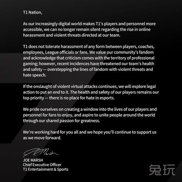 T1不容忍选手、教练、员工、联盟官员或粉丝之间任何形式的骚扰。我们重视我们社区的粉丝,并承认合理的批评是职业电竞的常态;但是,最近发生的事件已经威胁到我们队伍的健康和安全--暴力威胁和仇恨言论已经超出了随意性的界限。