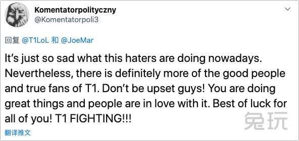 现在这种人的做法实在是太可悲了。不过,T1真正的粉丝肯定是多的。你们不要难过!你们在做着伟大的事情,人们都爱上了它。祝大家好运!T1 FIGHTING!!!