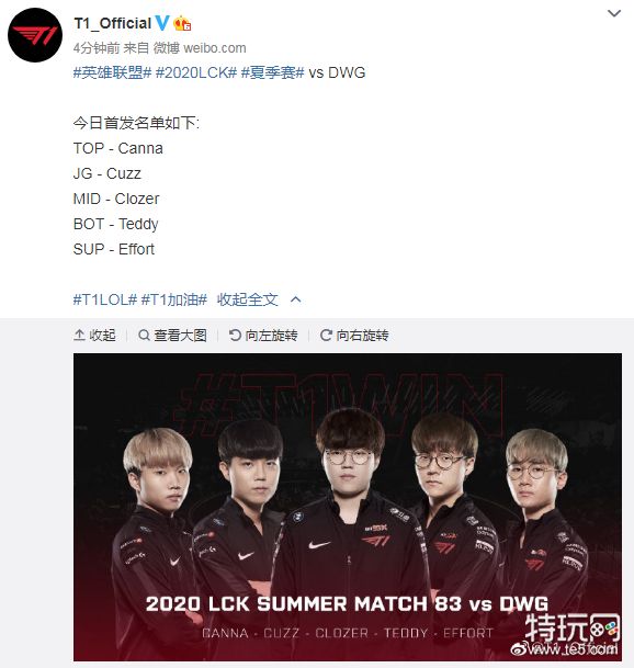 T1 vs DWG今日首发名单如下:TOP - CannaJG - CuzzMID - ClozerBOT - TeddySUP - Effort