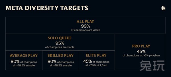 除了“英雄平衡框架”中的目标,我们还为不同水平的对局设定了生态多样性目标。目前,对职业赛场的目标是45%的英雄出场率达到5%以上。我们认为此目标代表了一种健康的游戏生态,各路英雄能在丰富多彩的战术中找到适合自己的不同角色。