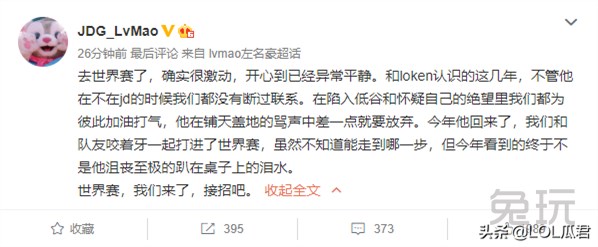 而作为JDG老队长的Lvmao感想肯定是最多的,坚守四年,守得云开见月明着实不容易,不过晋级世界赛他最先发表的感想却是为搭档Loken不平与开心。