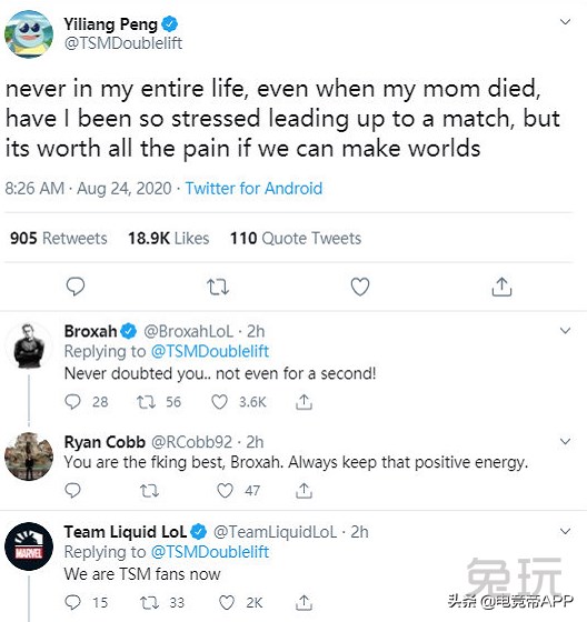 随后Broxah和TL相继进行了回复,以鼓励这位老朋友: