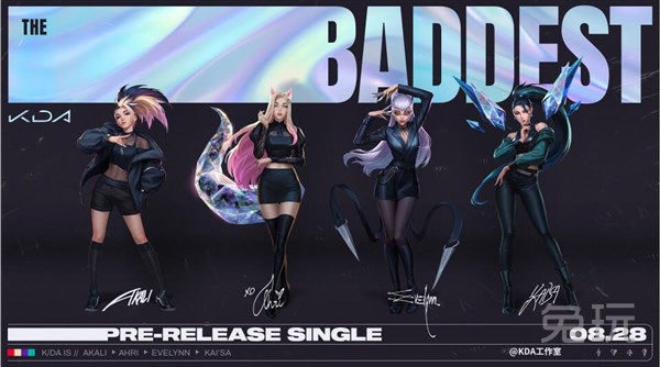THE BADDEST是继2018年K/DA出道单曲POP/STARS之后的第二支单曲,今天正式发布歌词版音乐录影带。新单曲的演唱阵容包括韩国流行音乐女团(G)I-DLE成员SOYEON、MIYEON,以及新加入的合作艺人Bea Miller 和Wolftyla。