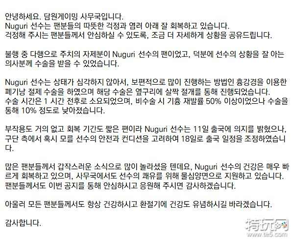 这一突然的消息让很多粉丝们受到了惊吓,但Nuguri选手的身体正在迅速地康复之中,为了让他尽快痊愈,队伍也正在物质与精神两方面上提供着支持,希望粉丝们能在看到这一公告之后放下心来,为我们应援,谢谢大家。