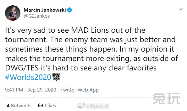 Jankos:看到MAD被淘汰太难过了。对面就是比他们强,有时候事情就是这么发生了。在我看来这让这次世界赛更令人激动了,因为除了DWG和滔搏,真没有看到其他夺冠热门了。