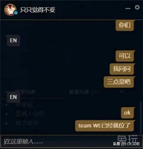 WE辅助Missing在直播时忽然收到了来自兮夜的消息,询问下午三点是否有空训练赛,Missing闻言精神一振,才和兮夜确认时间,得到答复就回了一句:team WE已经就位。