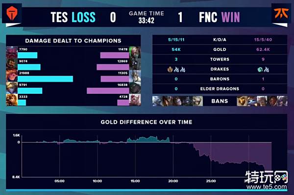 32分钟:FNC开打大龙,TES前来阻止,炼金闪现背回奥恩,FNC几人先集火将其击杀后洛大招转好再次开团开到男枪将其瞬秒,EZTP赶来也只是杯水车薪,FNC打出一波0换4后选择一波结束比赛。