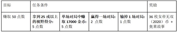 解锁女帝无双(2020)门票后,即可获得任务,每周累积一定胜场即可获得大量女帝无双(2020)币奖励,帮助召唤师合理安排时间!