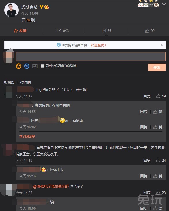 另外,在虎牙直播的官总,也直接发文暗讽RNG真牛了!官总可是和原DMO战队的选手关系非常好,GALA就是官总极力推荐去RNG的,想必阿乐去RNG这件事,官总有参与到其中。但现在阿乐这样被鸽了,官总自然就很不爽了,但又不能说的这么明白,就只能当谜语人来暗讽这件事情了。