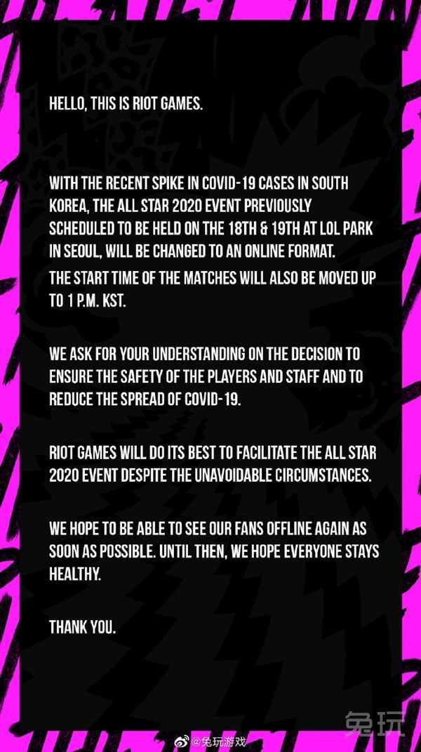 LCK:由于新冠疫情,原定于12月18日-19日在LOL PARK举办的全明星赛将改为线上赛。