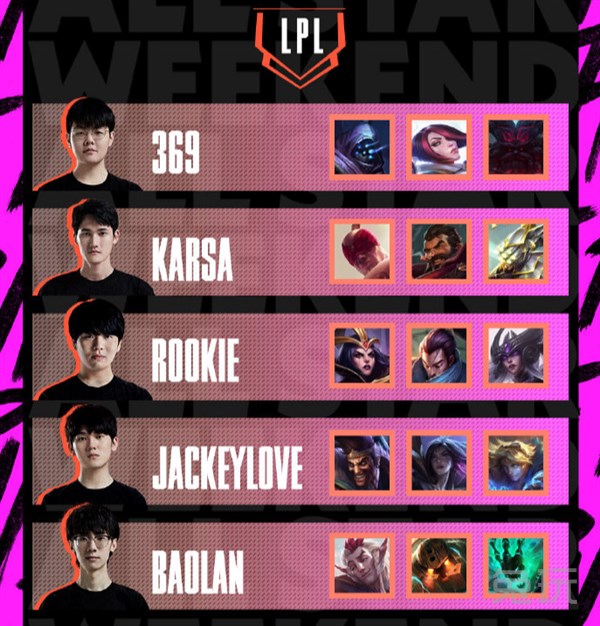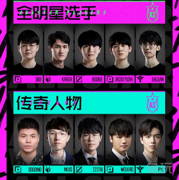 首先,就是LPL与LCK的全明星选手与传奇人物。LPL的全明星选手分别是由369、Karsa、Rookie、Jackeylove以及宝蓝组成;而LPL的传奇人物则分别是由Gogoing、Mlxg、姿态、微笑以及Pyl组成。