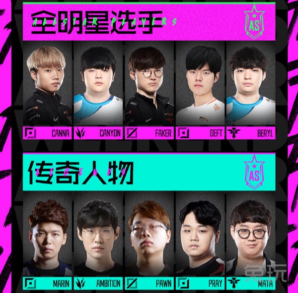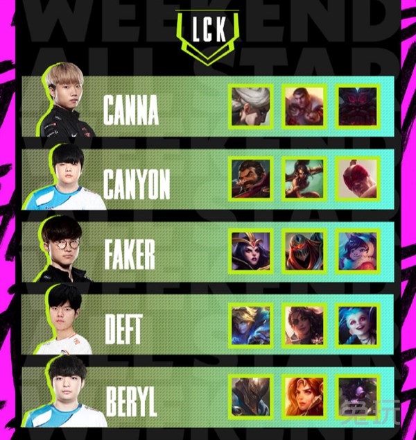 而LCK的全明星选手分别是由Canna、Canyon、Faker、Deft以及BeryL组成;LCK的传奇人物则分别是由Marin、Ambition、Pawn、Pray以及Mata组成。