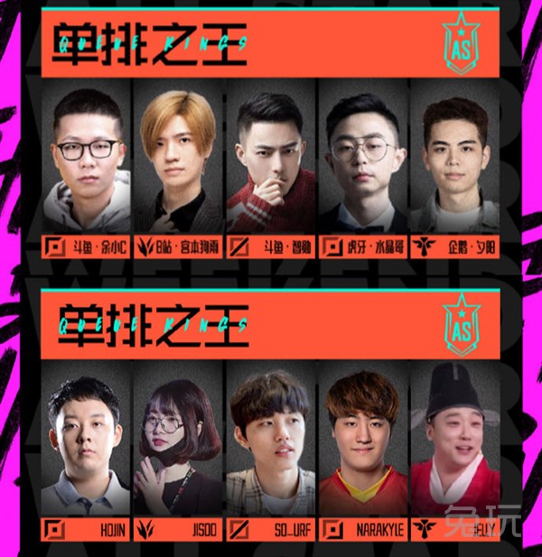 除了全明星选手与传奇人物之外,此次全明星赛中同样有由主播所组成的“单排之王”!LPL赛区的“单排之王”是由余小C、宫本狗雨、智勋、水晶哥与夕阳组成;而LCK赛区的“单排之王”则是由Hojin、Jisoo、So_Urf、Narakyle以及Jelly组成。