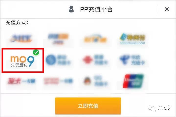 打开PP助手平台的任意游戏→点击“充值”或者“商店”→选择所需商品→点击“立即充值”→选择“mo9先玩后付”并确认→输入“手机号”及“验证码”→确认支付→完成交易。